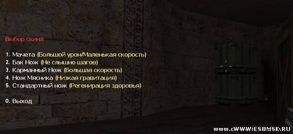 Knife Mod V.1.0 RUS - Данный плагин даёт возможность каждому игроку приобрести себе бесплатно новый вид ножа, только не обычного а со специальными возможностями, данный плагин очень популярен на серверах с Deathrun Mod'om, игрокам он приходится по душе.